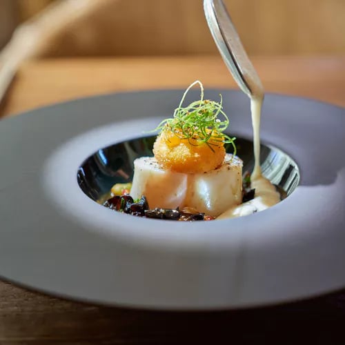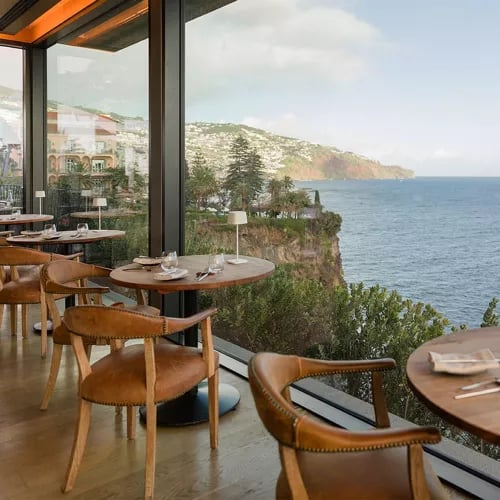 Vitrine gastronomique du groupe PortoBay, cette table célèbre le végétal à travers une cuisine moderne et équilibrée. Les légumes proviennent du potager maison ou de producteurs madériens, sublimés dans un houmous de poivrons rôtis et carottes. Le filet de sabre en nage de moules met en valeur les produits de la mer locaux, tandis qu'une Crema Catalana aux fruits du jardin conclut le repas avec créativité.