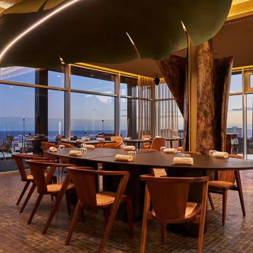 Sa silhouette ondulante de seize étages domine le front de mer de Funchal, le hall ponctué d'un lustre monumental tissé de près de six kilomètres de chaîne métallique. La designer madérienne Nini Andrade Silva décline des motifs botaniques — panneaux floraux sculptés, treillis de bronze inspirés des dentelles traditionnelles. Le Laurea Spa, parmi les plus vastes du Portugal, s'inspire de la forêt de lauriers classée UNESCO, tandis que les piscines panoramiques surplombent l'Atlantique.