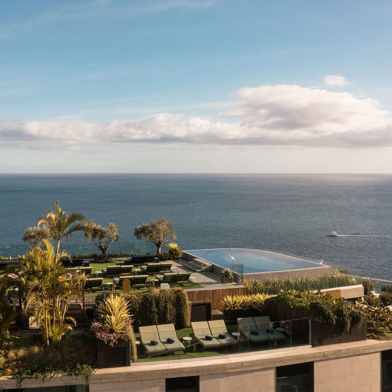 Perché aux derniers étages du Savoy Palace, cet établissement de 43 chambres fonctionne comme un refuge exclusif accessible par ascenseur privé. Les suites d'angle offrent des balcons panoramiques sur la côte de Madère, tandis qu'une piscine à débordement sur le toit et une terrasse bordée de palmiers garantissent une intimité rare. Le spa s'inspire des forêts anciennes de l'île ; le soir, Madère et gâteau au miel accompagnent le coucher.
