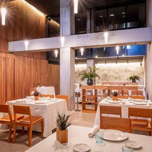 Attenante à La Fábrica mais résolument singulière, la table étoilée du chef Ricardo Temiño orchestre un parcours immersif : apéritifs dans la cave à vins, passage en cuisine pour observer l'affinage de l'agneau, puis installation dans une salle contemporaine à cuisine semi-ouverte. Deux menus dégustation—Camino Corto et Camino Largo—tissent souvenirs intimes et grandes routes historiques de la province, du Chemin de Saint-Jacques à la route du Cid.