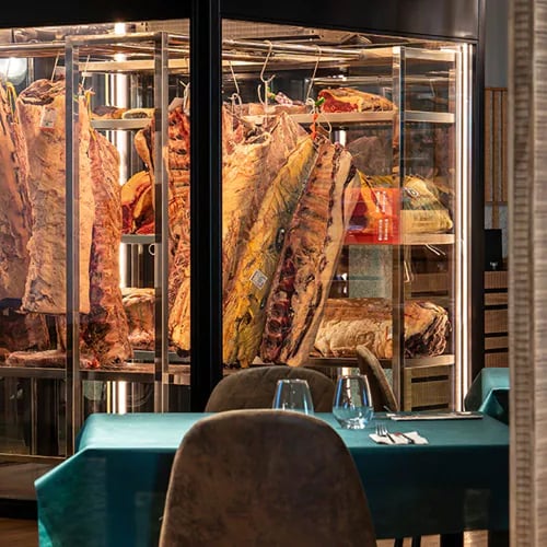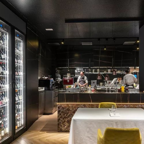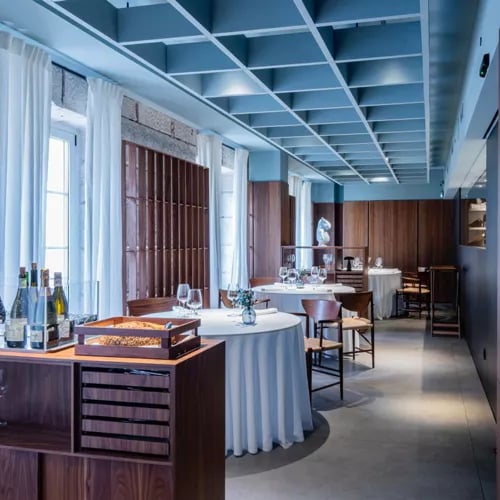 Aux portes de Burgos, le chef Guillermo Martínez de Marigorta — sacré meilleur maître grilleur d'Espagne en 2024 — officie devant les flammes vives d'une cuisine ouverte. La salle à manger donne sur une impressionnante chambre de maturation où reposent bœuf et pièces de choix. Une adresse franche, destinée aux amateurs de viande exigeants, où la qualité du produit et la maîtrise du feu priment sur tout artifice.
