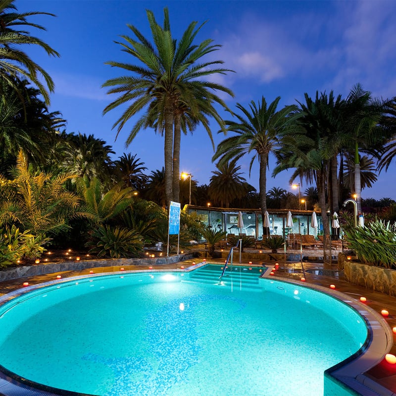 Vaste complexe de 328 chambres redessiné par Alberto Pinto, le Seaside Palm Beach arbore une élégance rétro assumée : couleurs vives, objets d'art singuliers, lignes héritées des années soixante-dix revisitées avec sophistication. Cinq piscines ponctuent les jardins tropicaux, un spa complet et quatre restaurants composent l'offre sur place. Les familles profitent d'un club enfants ouvert toute l'année et de chambres communicantes, tandis que l'aube révèle les dunes de Maspalomas.
