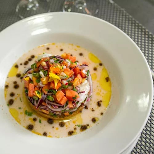 À deux pas de la plage de Las Alcaravaneras, le chef-propriétaire Carmelo Florido orchestre une cuisine créative solidement ancrée dans le terroir canarien. Son ceviche canario réinterprète le classique avec finesse, tandis que les carajacas—foie de veau sauté, oignons caramélisés, bâtonnets de pommes de terre—célèbrent la tradition insulaire. En dessert, les huevos moles au gofio grillé offrent une intensité gustative remarquable. Distinction Bib Gourmand.