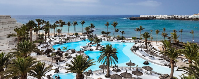 Sur la côte méridionale de Lanzarote, ce vaste complexe de 720 chambres traduit l'austérité volcanique de l'île en lignes épurées et teintes minérales. Les terrasses dominent l'Atlantique jusqu'aux silhouettes de Fuerteventura. L'établissement séduit particulièrement les familles : bassin pour enfants agrémenté de toboggans en forme de navire corsaire, spectacles en soirée et configurations variées de chambres composent une offre pensée pour les séjours multigénérationnels.