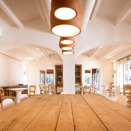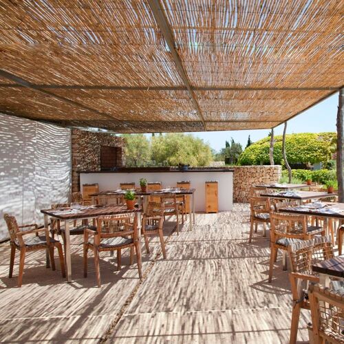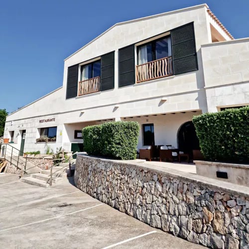 Mas menorquin converti en table champêtre, Santa Mariana cultive son potager biologique, élève agneaux et volailles, récolte ses propres olives. La carte décline légumes, fruits de mer, riz et pâtes ; le menu El Renacer revisite la cuisine locale avec finesse méditerranéenne. Sur réservation, le homard devient l'unique protagoniste. La terrasse ombragée prolonge ce repas ancré dans le terroir insulaire.