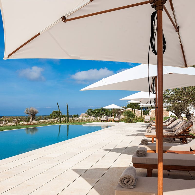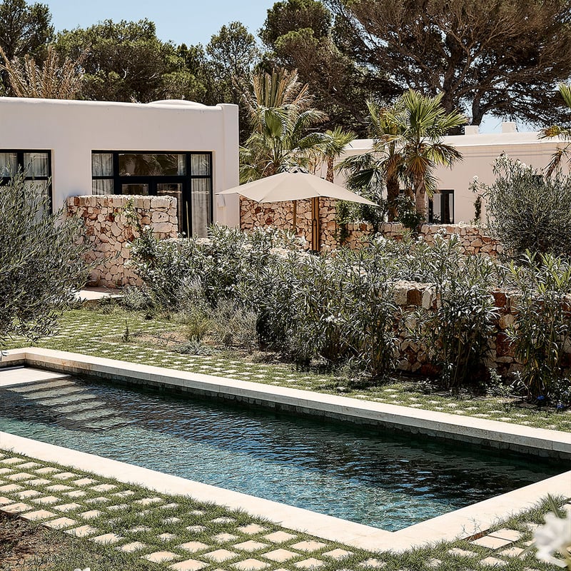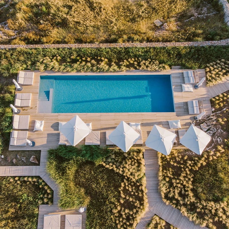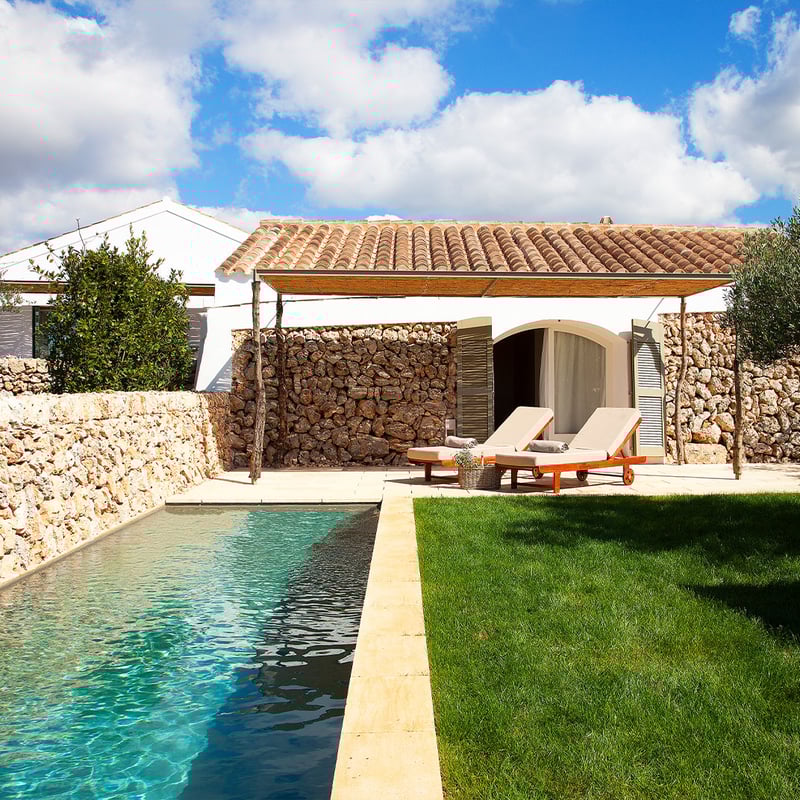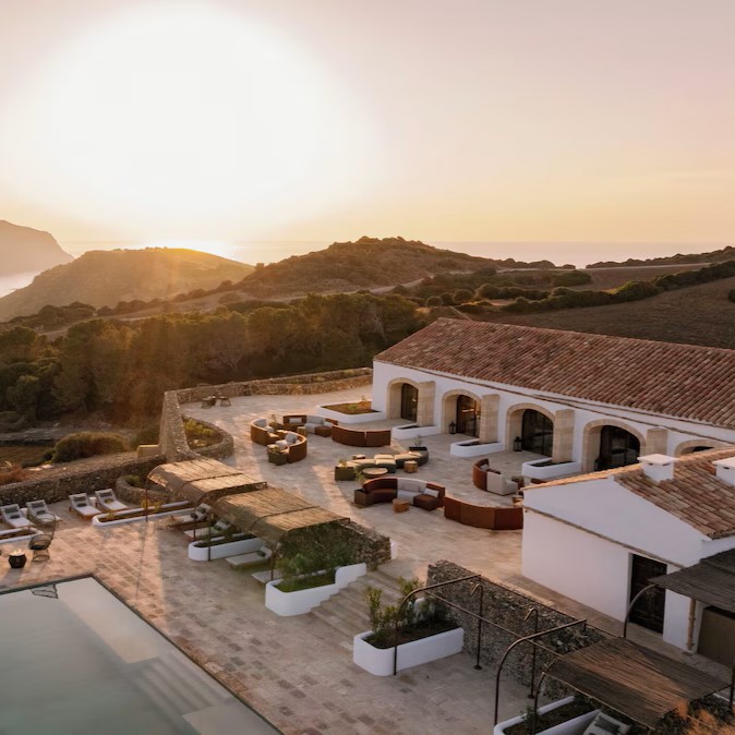 Ancienne base militaire perchée sur les falaises méridionales de Minorque, Cap Menorca déploie quinze suites à travers 75 acres de pinède et d'oliviers centenaires. Chaque retraite, cernée de murets de pierre sèche traditionnels, s'ouvre sur une piscine privée d'eau salée aux dimensions généreuses. Sols en terre cuite, boiseries d'acajou, carrelage émeraude évoquent les fincas locales. Excursions en yacht vers des criques secrètes, massages face au large.