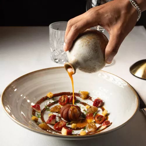Dans une finca du XVIIe siècle cernée de vignes, le chef Gorka Txapartegui — figure de la gastronomie basque à Hondarribia — signe une cuisine créative européenne ancrée dans les saveurs minorquines. La terrasse paisible surplombe jardins luxuriants et piscine à débordement, tandis que l'assiette célèbre les produits insulaires avec finesse. Une adresse distinguée par le Guide Michelin pour les dîners champêtres.