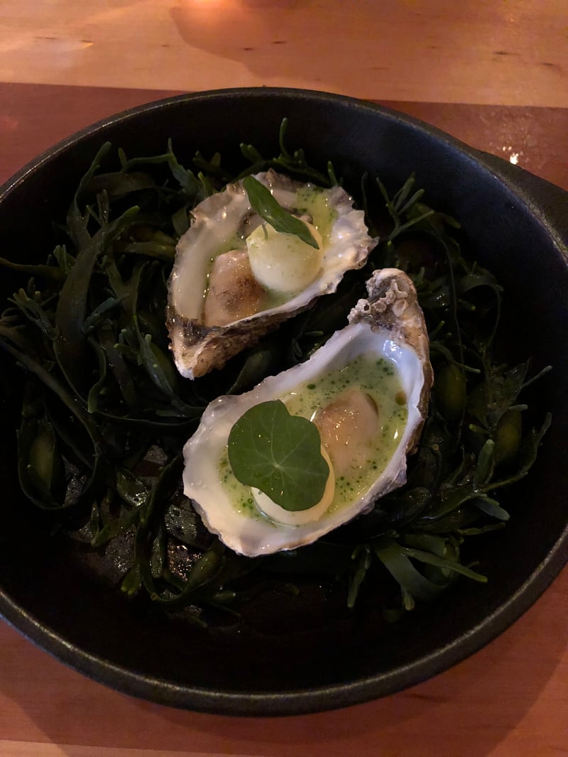 Du côté de la salle, elle colle parfaitement à l'esprit de la cuisine que l'on va déguster. On retrouve des matériaux chaleureux comme le bois, le cuir qui orne les chaises et les banquettes, ainsi qu'un superbe bar en pierre où quelques chanceux convives peuvent s'y installer. Une fois à table, nous avons consulté le menu unique qui nous sera servis : pas de carte, seulement un menu dégustation en 5 services auquel on peut ajouter un plat signature et un assortiment de fromage. En attendant les premiers plats, on admire la brigade qui s'affaire, chacun avec un look assez hipster qui colle parfaitement au cadre. Une petite odeur boisée vient titiller nos narines qui a le mérite de nous mettre rapidement en appétit !