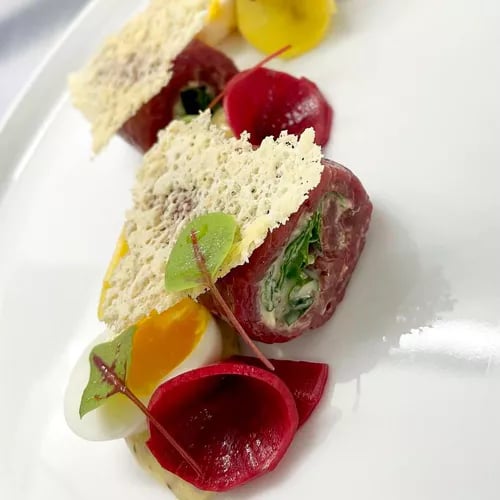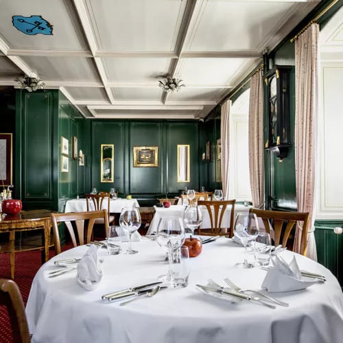 Aux fourneaux de cette table Bib Gourmand, Alain Koenig privilégie une cuisine organique où le poisson règne en maître. Deux formules rythment le repas : le Complet en quatre services ou la Degustation déclinée jusqu'à six temps. Le décor classique et le service prévenant complètent l'expérience, tandis qu'une cave voûtée historique accueille les célébrations privées dans une atmosphère singulière.