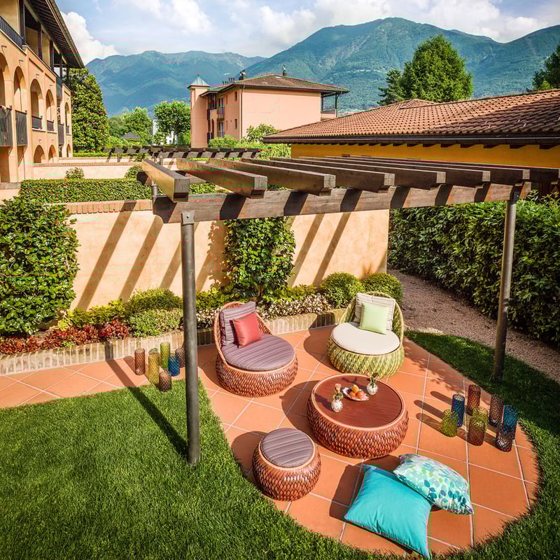 Sur un domaine agricole de 140 hectares dans le delta de la Maggia, ce resort lacustre cultive ses propres vignes à la Cantina alla Maggia et approvisionne trois restaurants, dont la Locanda Barbarossa étoilée. Le plus grand spa du Tessin déploie 2 500 mètres carrés entre bain turc et jacuzzi, tandis qu'une plage privée et des ânes en résidence séduisent autant les familles que les amateurs de bien-être.