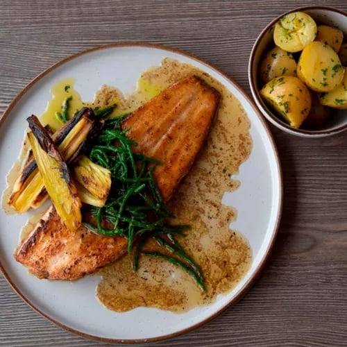 Dans une bâtisse dont les origines remontent au XIe siècle, une cuisine britannique moderne s'approvisionne directement au potager de l'établissement. Les assiettes, nettes et maîtrisées, mettent en valeur des produits d'une fraîcheur irréprochable, tandis que les cheminées réchauffent des salles pleines de caractère. Le crumpet au gras de bœuf et le sticky toffee pudding signent une table attachante à prix doux.