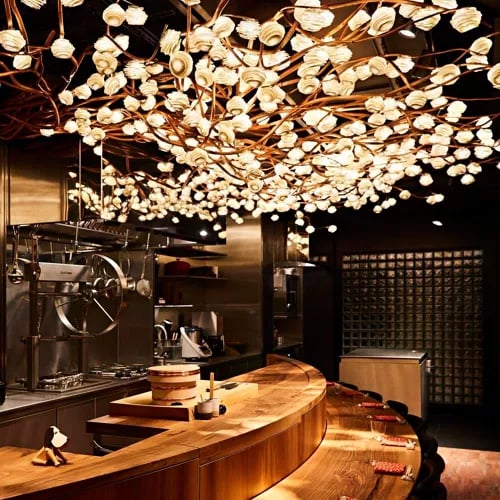 Transplanté de Beyrouth à Marylebone, Mayha déploie son omakase saisonnier autour d'un comptoir en bois courbé où les chefs officient sous des luminaires arborescents diffusant une lueur feutrée. Les ingrédients nobles se succèdent avec une théâtralité assumée, les nigiri généreux constituant le cœur du repas. Un cadre raffiné, idéal pour un dîner en tête-à-tête ou une célébration intimiste.
