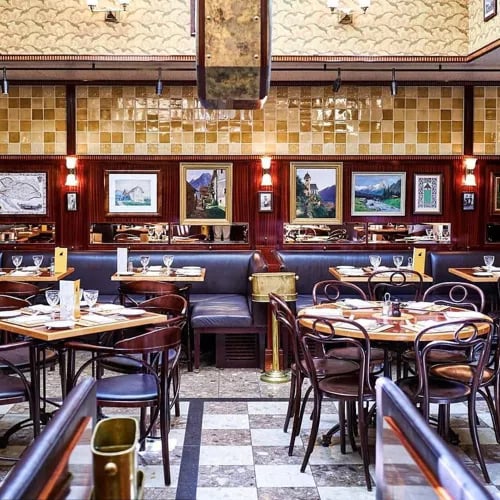 Fischer's transpose l'atmosphère chaleureuse des cafés viennois sur Marylebone High Street, proposant une cuisine d'Europe centrale exécutée avec précision. Les schnitzels, dorés et croustillants à souhait, méritent la garniture Holstein — œuf au plat et câpres. Le matin accueille œufs et viennoiseries, l'après-midi les gâteaux d'une vraie konditorei. Issue de la même maison que The Wolseley, l'adresse fonctionne avec une fluidité rodée.